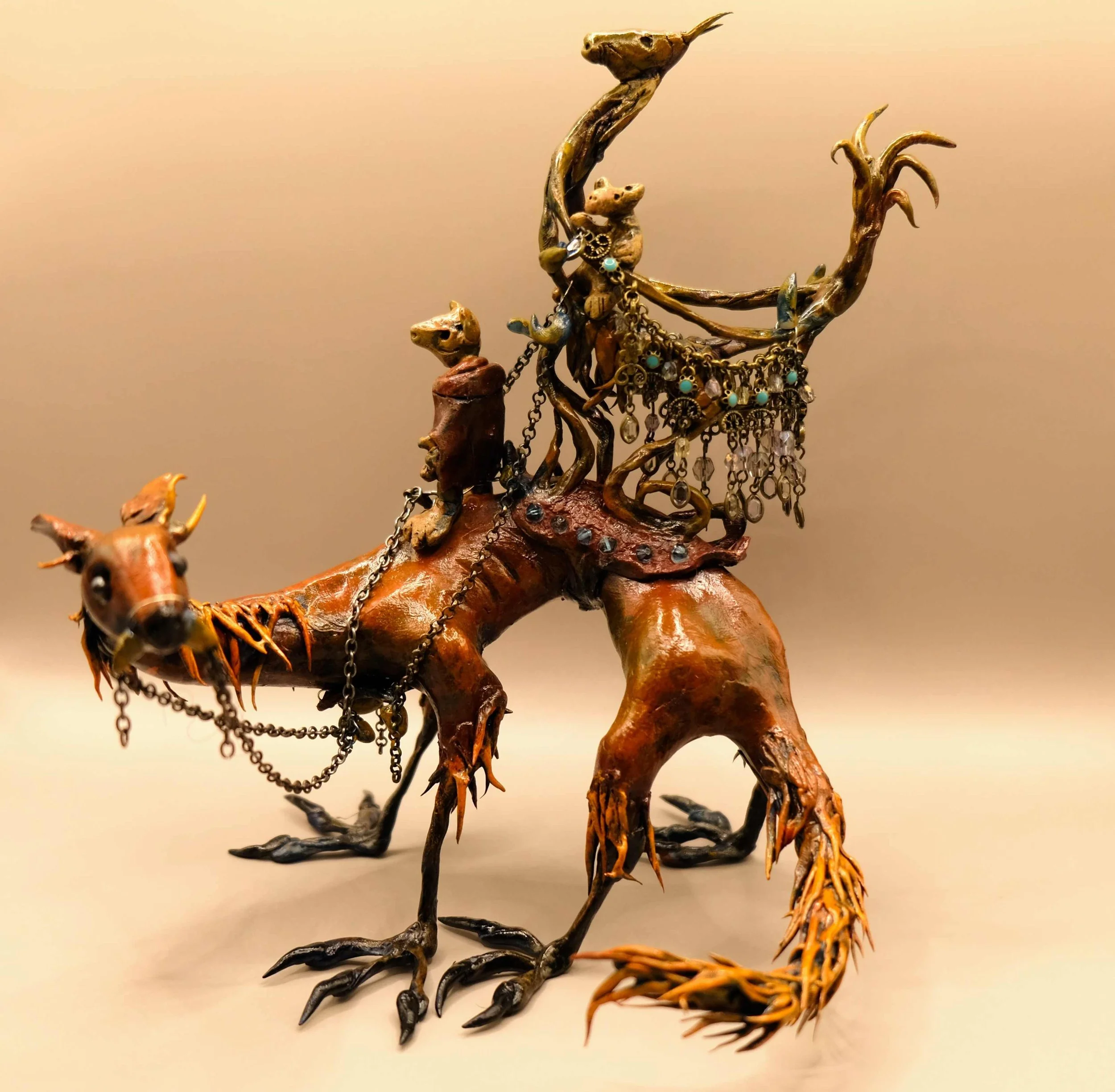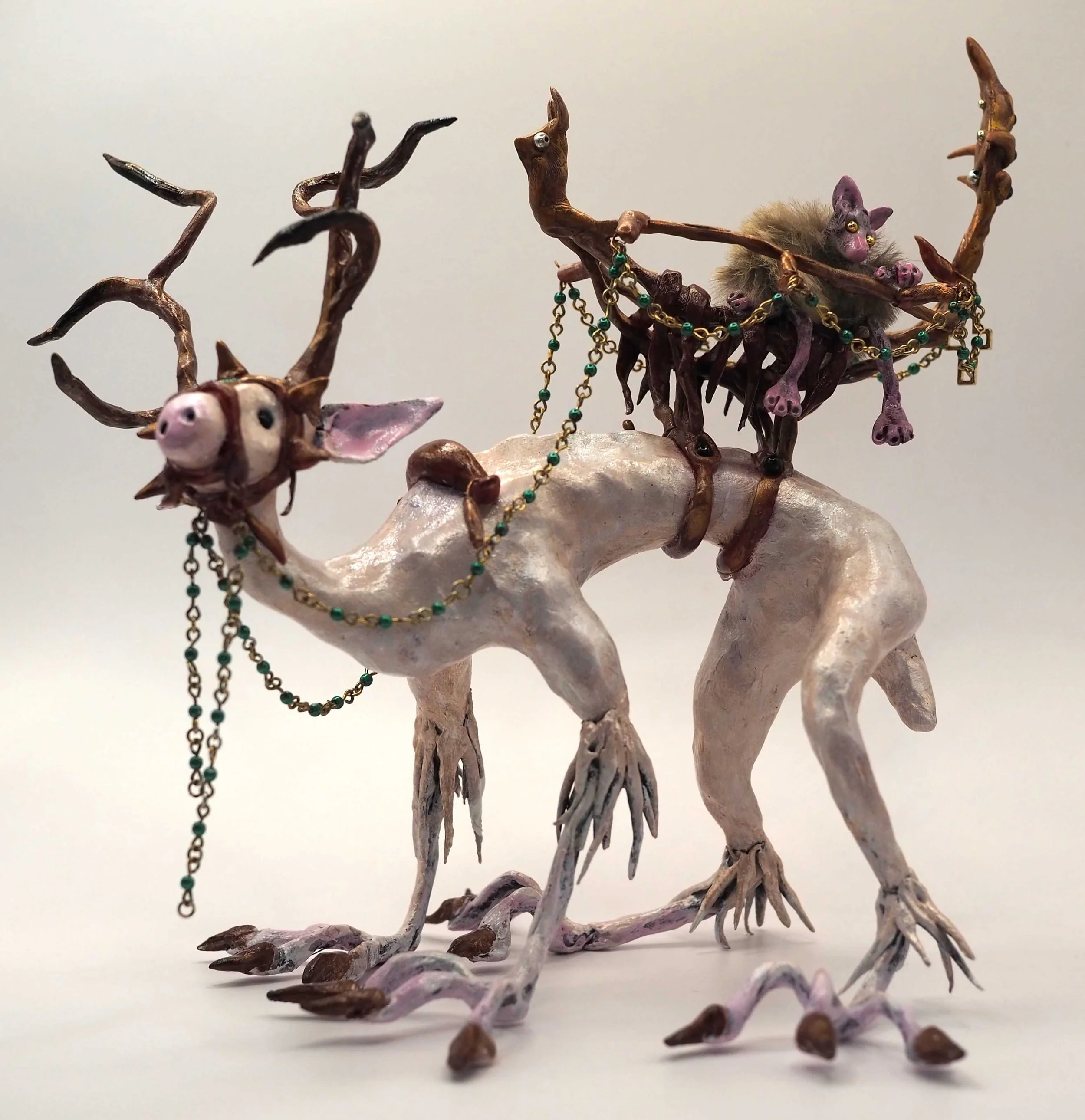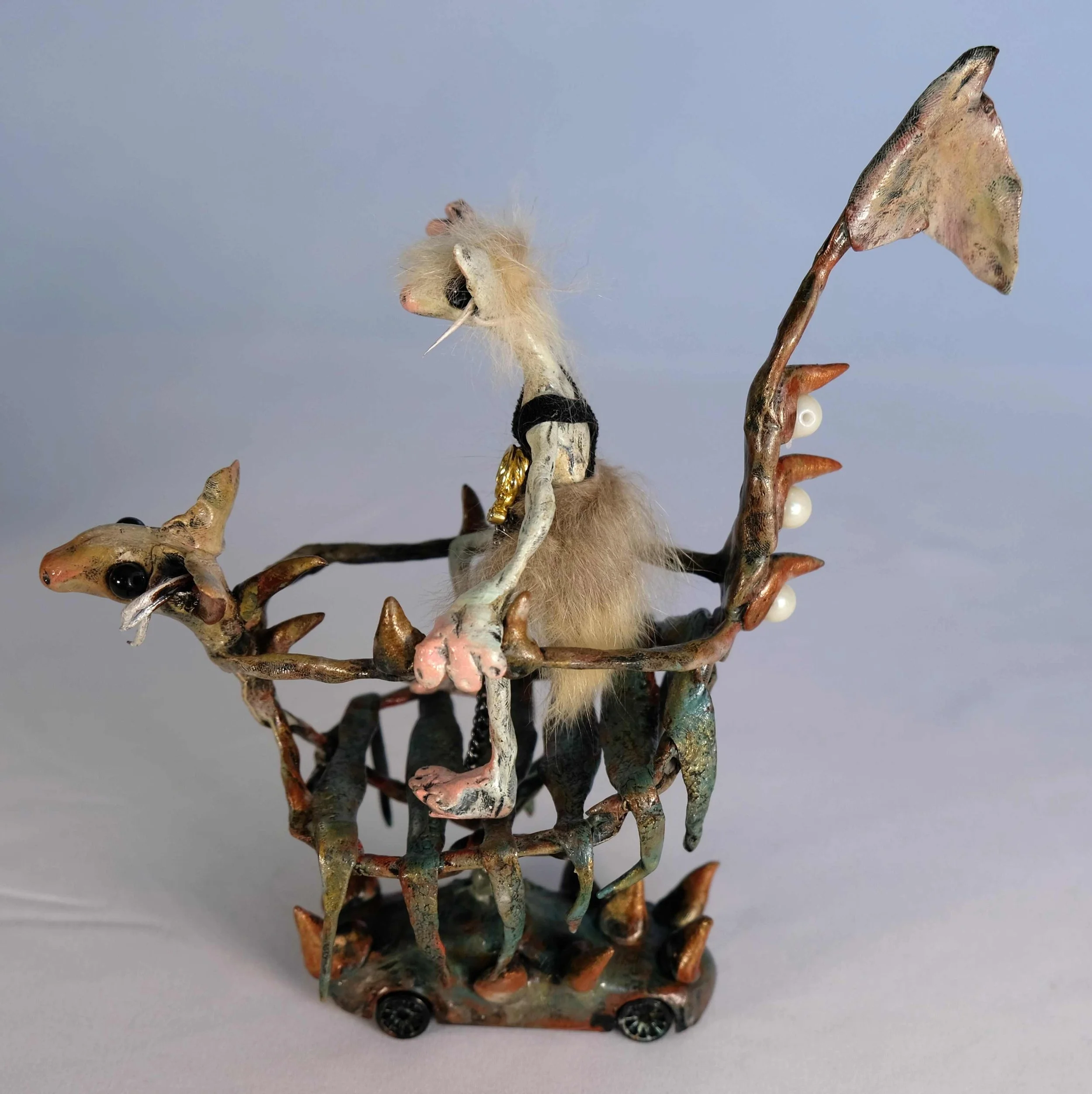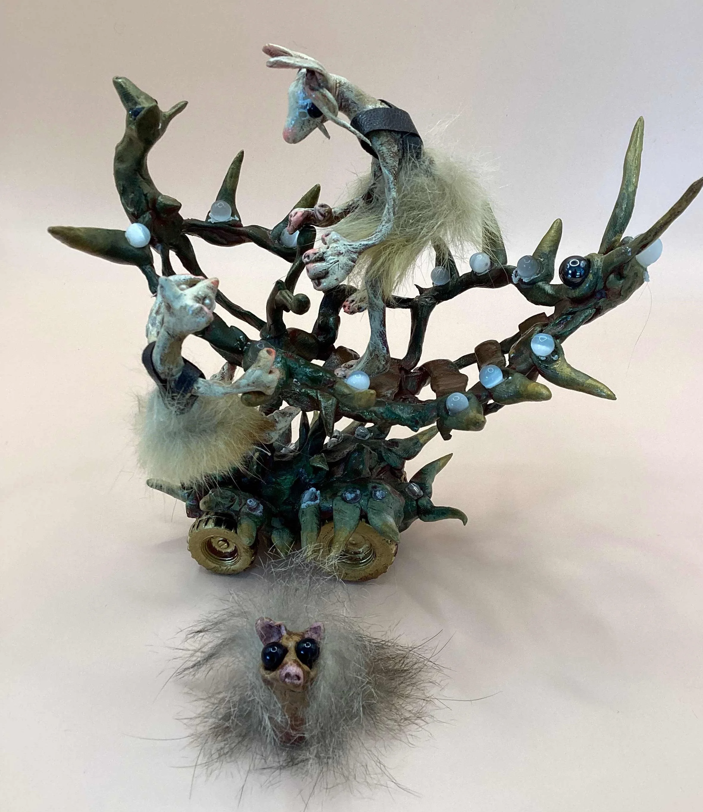 This gallery contains a selection of works from 2022-present. I use polymer and air-dry clay over a wire armature, with recycled jewelry and possum fur or fabrics. The works are continually evolving as I discover more ideas and techniques become more refined. I roam between smaller quirky and larger more elaborate works, just chasing ideas…