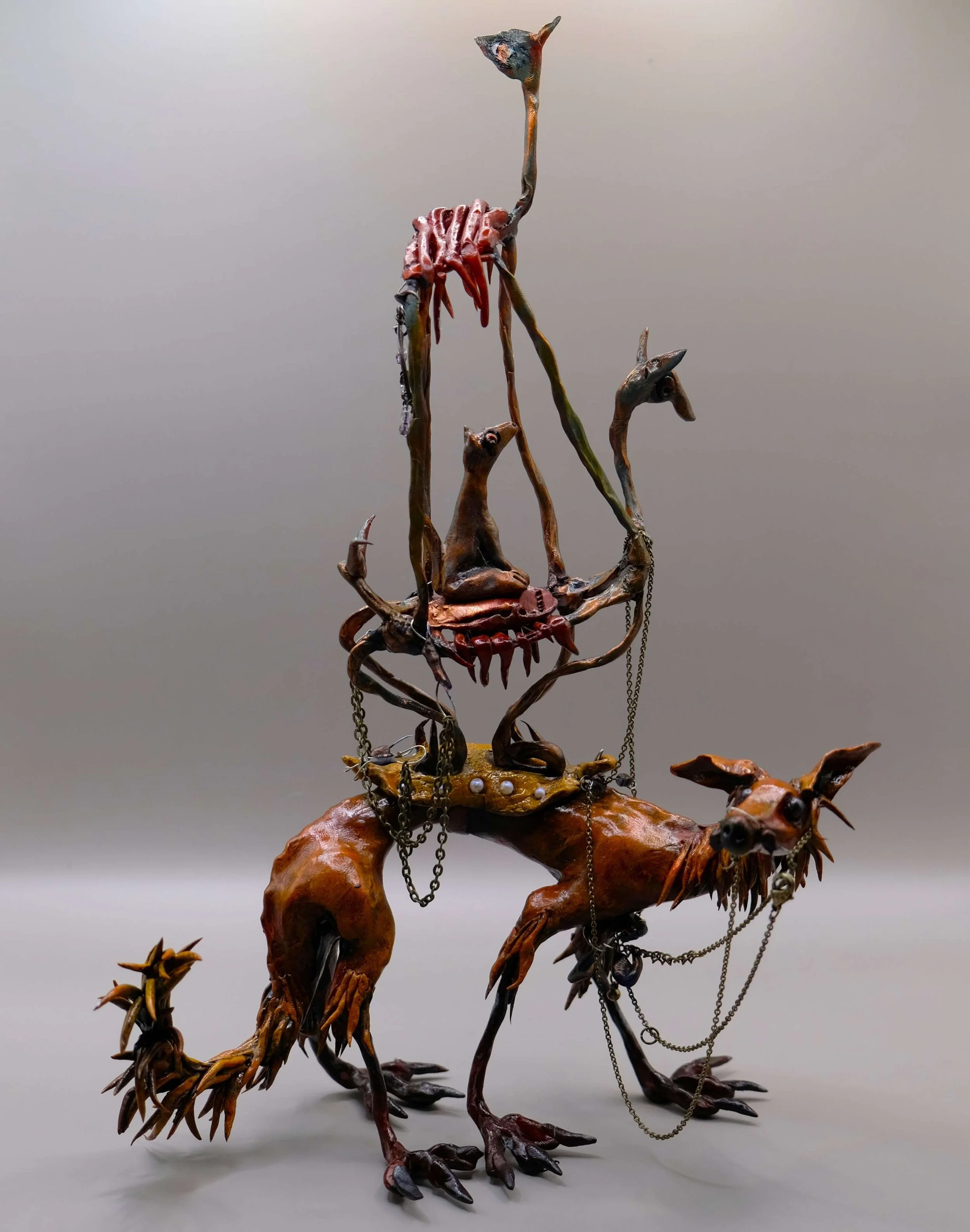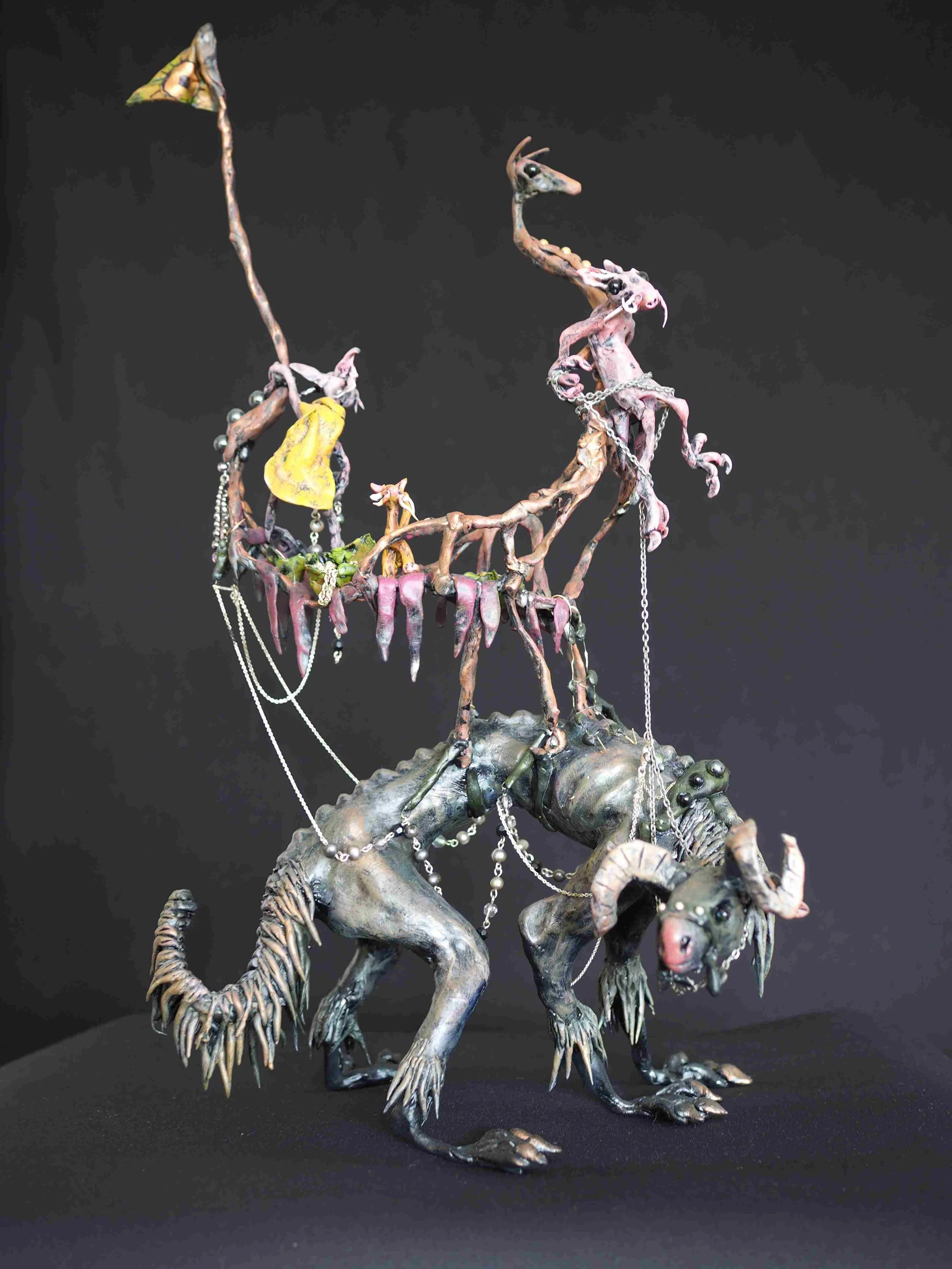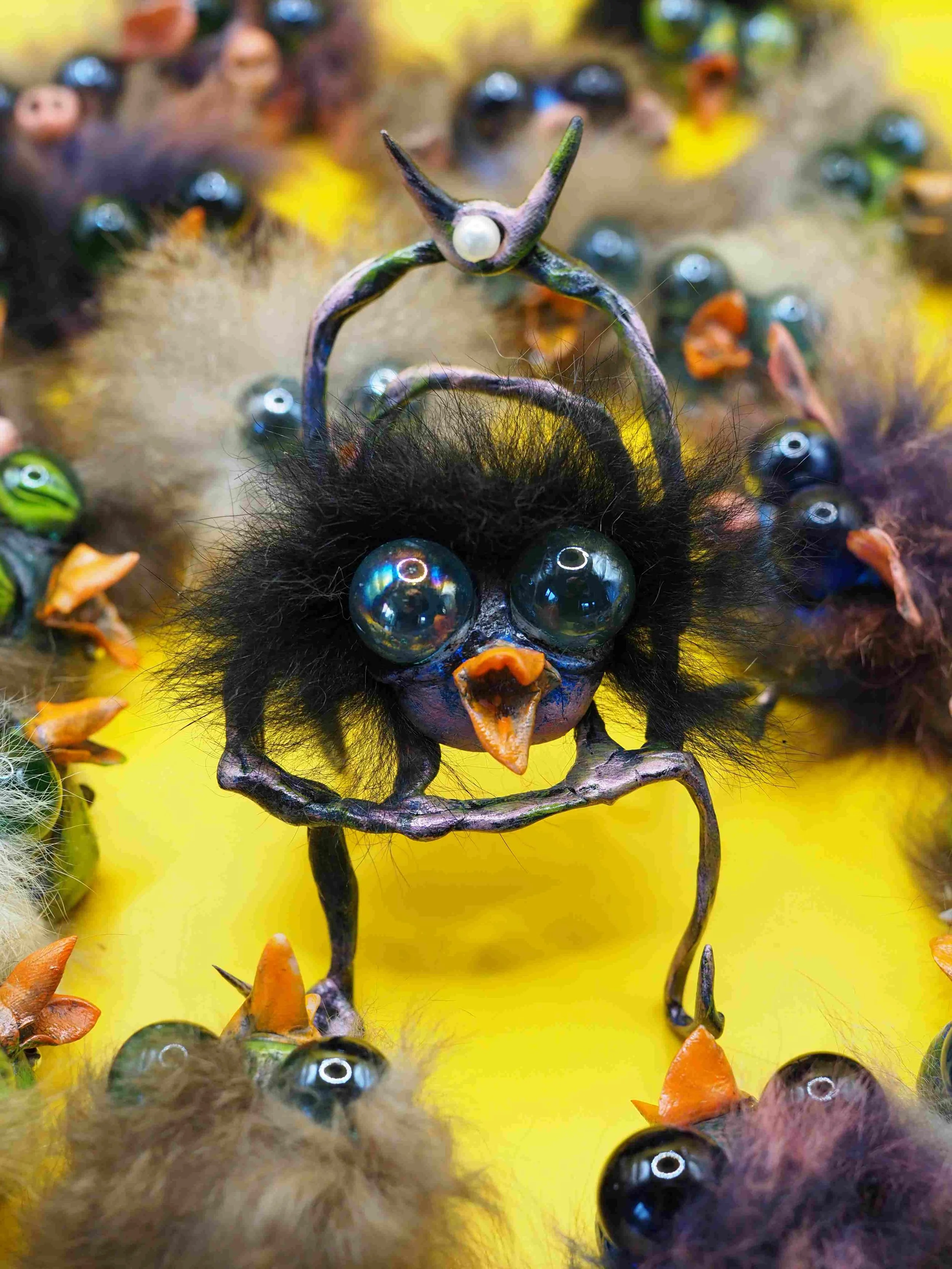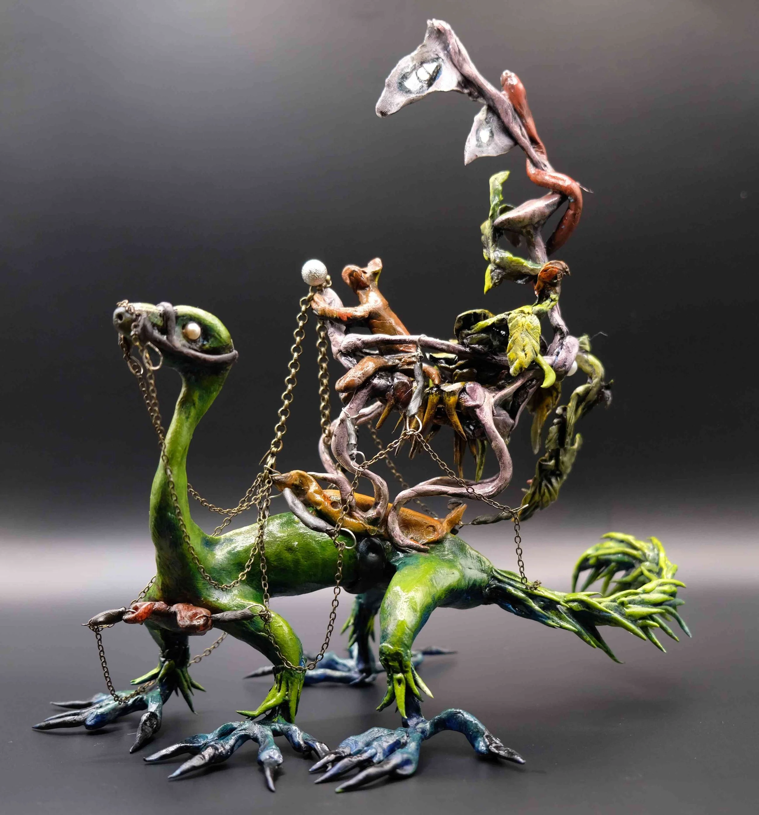 This gallery contains a selection of works from 2022-present. I use polymer and air-dry clay over a wire armature, with recycled jewelry and possum fur or fabrics. The works are continually evolving as I discover more ideas and techniques become more refined. I roam between smaller quirky and larger more elaborate works, just chasing ideas…