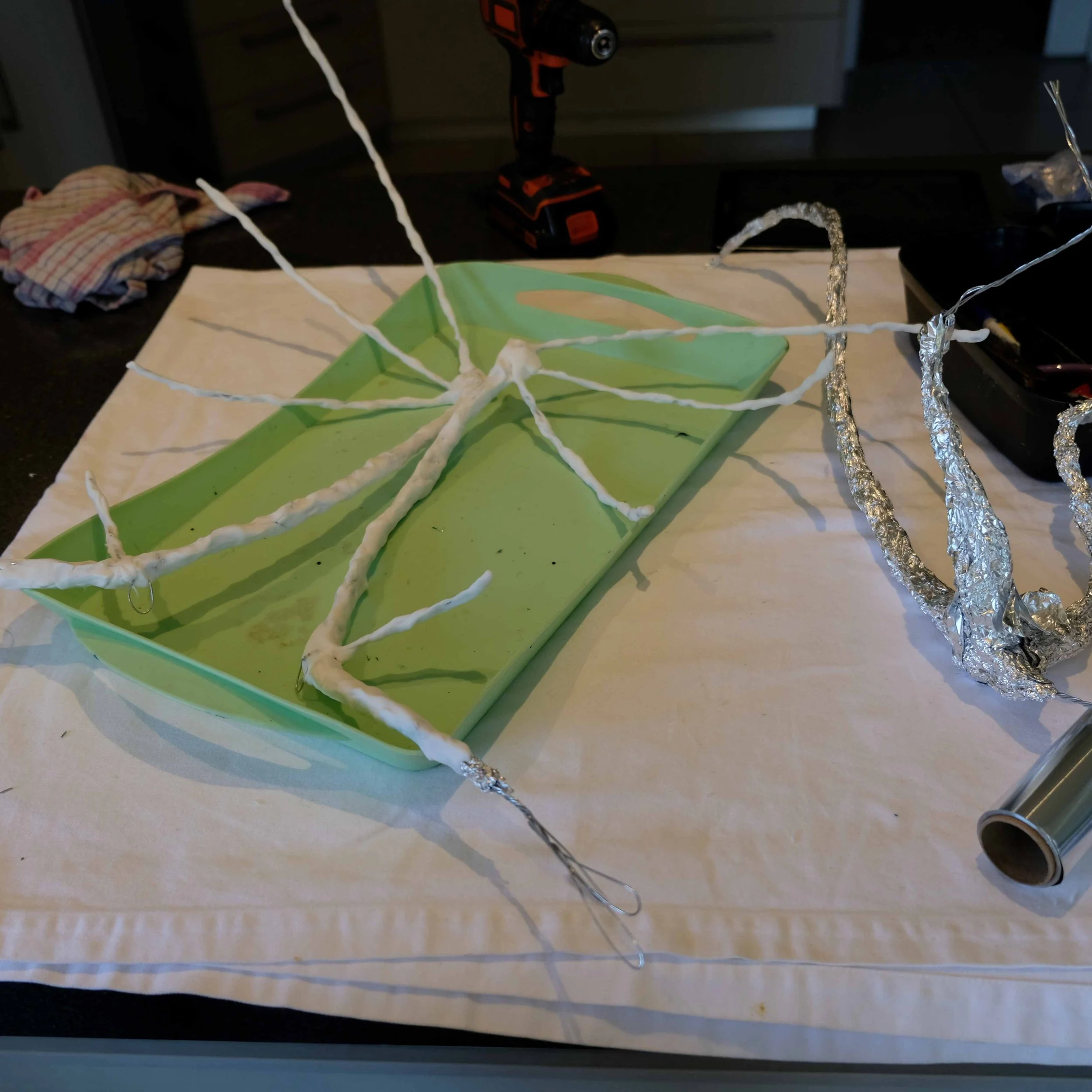 I knew I’d be using a lot of wire for the extensions, and as there will be a tendency for the wire to droop with the weight of the clay, I thought to join some of the wires together to minimize this. The air-dry clay is pretty light, but the amount I’ll be using will add a bit of weight.