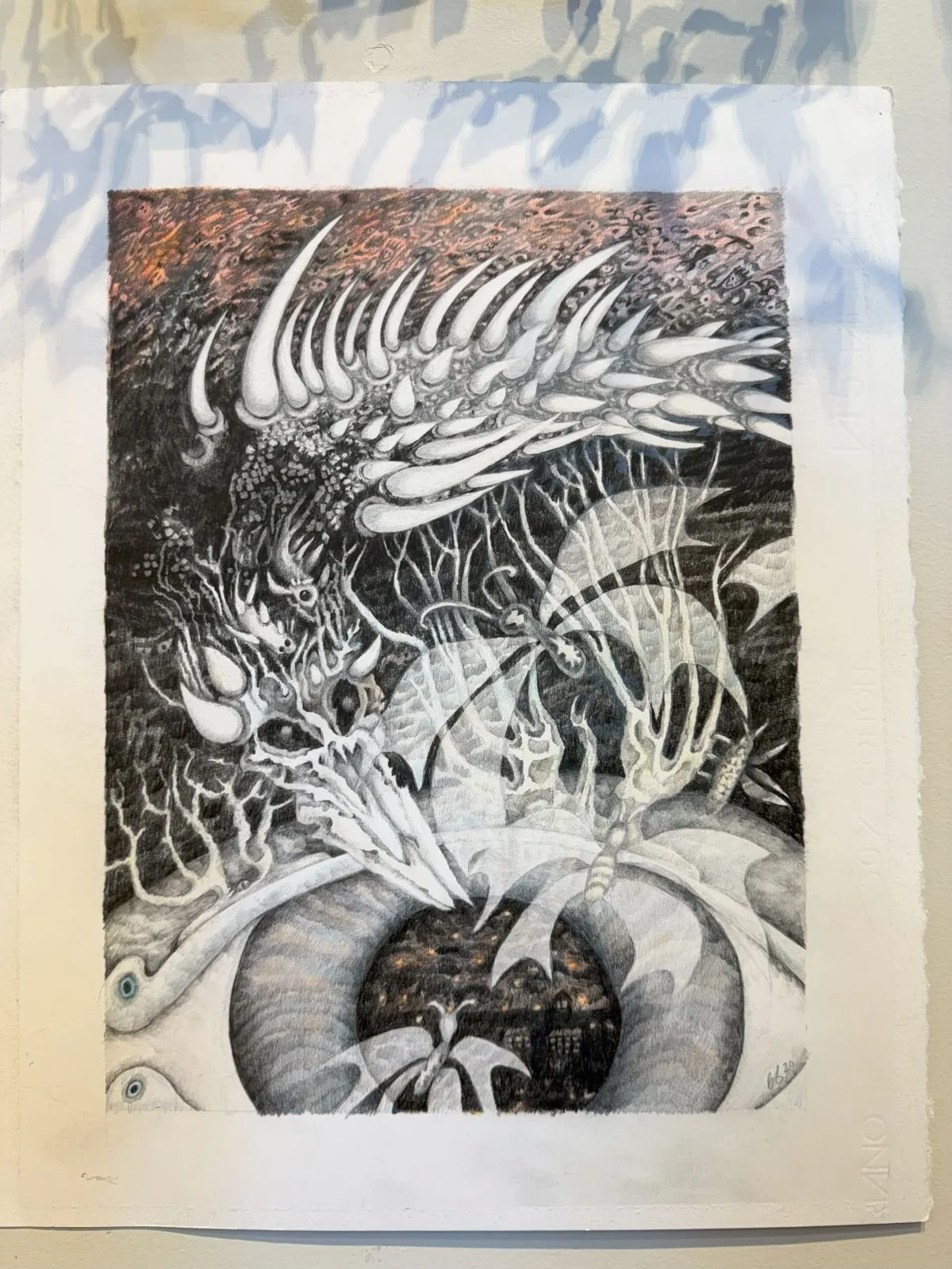 I had an artist’s talk about how I moved into making mixed media sculpture. When sifting through my past artworks I found one of my pencil pieces. I still have a love for making this style of work, it’s really an extended doodle. I start in much the same way as my sculptures, with a rough idea in my head that I build on as I go. I have a love of drawing on really nice paper, there’s something about how a smooth hot press heavy paper takes a pencil……