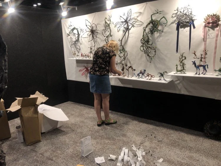 Al my trusty art assistant flew up with me and we set up Friday Afternoon. No setup is without its problems though! Because my work is quite fine it tends to disappear into the charcoal-grey panels so at the previous show I tried white fabric attached to the panels, with white shelves. It looked Ok, but I wasn’t satisfied with the look, still looked a bit drapey and tended to crinkle. I had what I thought was a genius idea to use bug netting, which was white, wouldn’t crinkle like fabric and would travel easily.