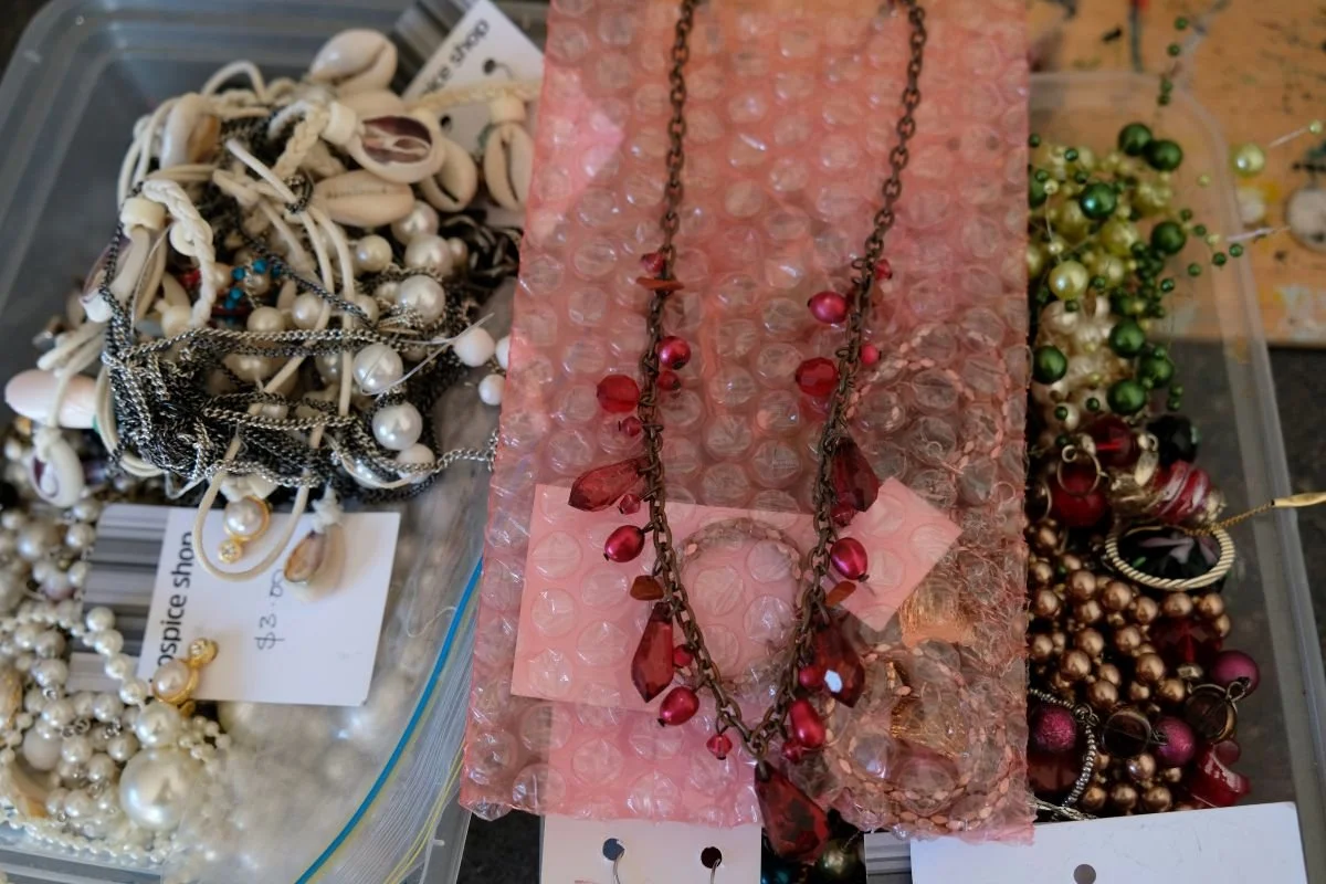 Some of my pieces I create and then hunt amongst my now impressive collection of jewellery bits, and with some I can almost see the finished artwork with a certain piece of jewellery on it. Well, I’ve had this red necklace in my collection for a while just waiting…….