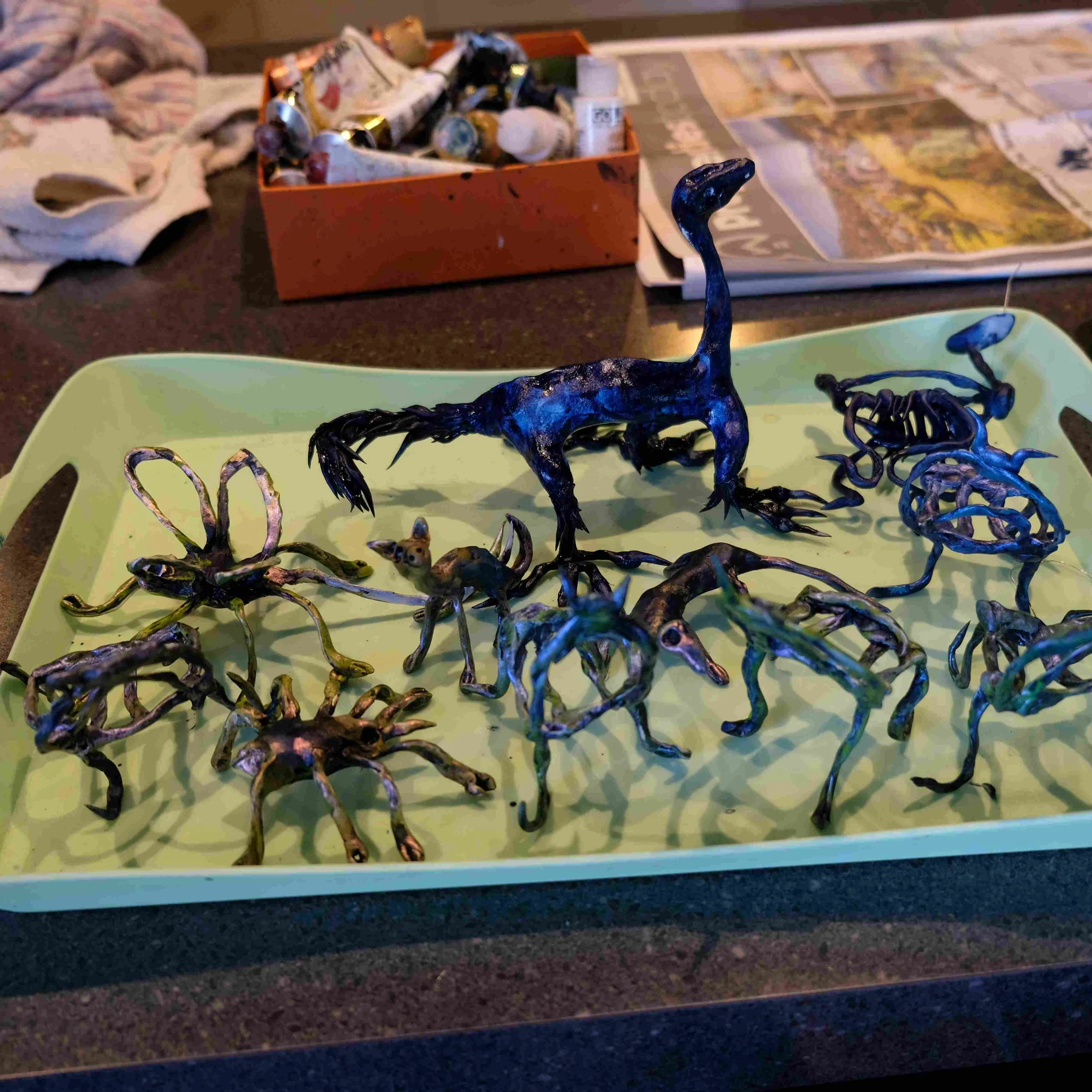 Painting the black undercoat on big sculptures is a messy business, because I have it reasonably thin to get into all the nooks and crannies, it flicks…over me and everything in the immediate surroundings. The drop cloth never is quite big enough, so I spend a bit of time cleaning as well.