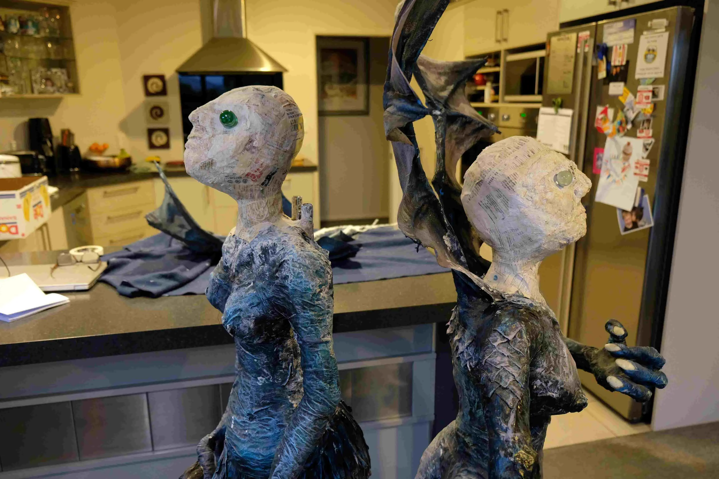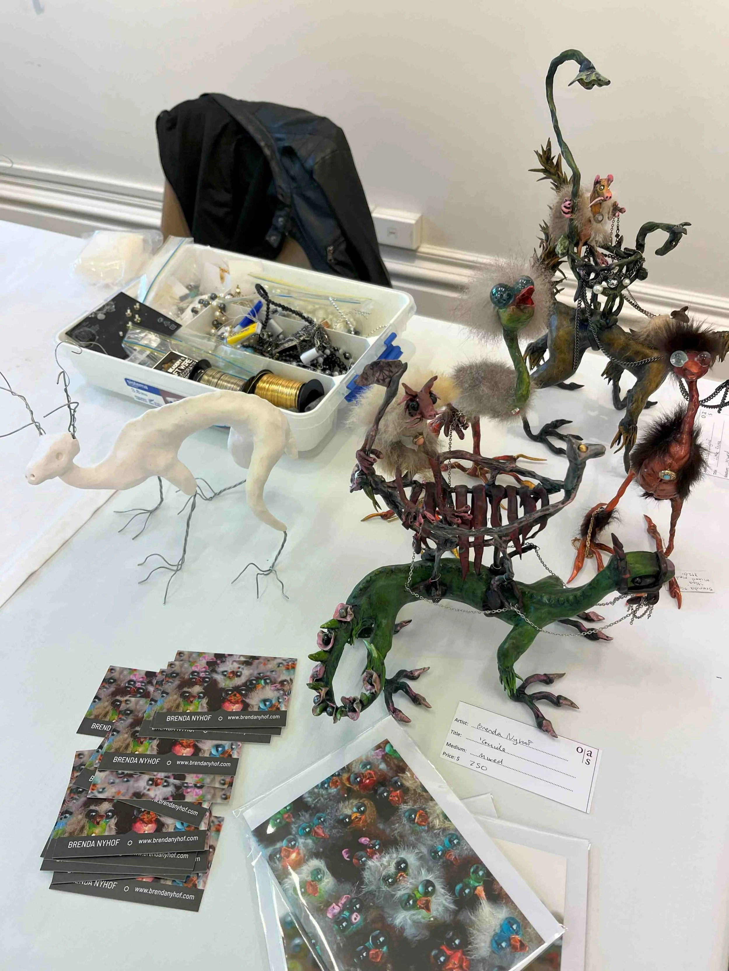 I was surprised how well my works travelled. I couriered two packages and the rest I packed into two hard-covered suitcases to go on the plane. Plenty of bubble wrap was used, and I packed them in firmly so there was no slopping around. The only mishap was a slightly bent toe, which was easily rectified. The work, being made from wire and polymer clay with a flexible air-dry clay is fairly robust though!