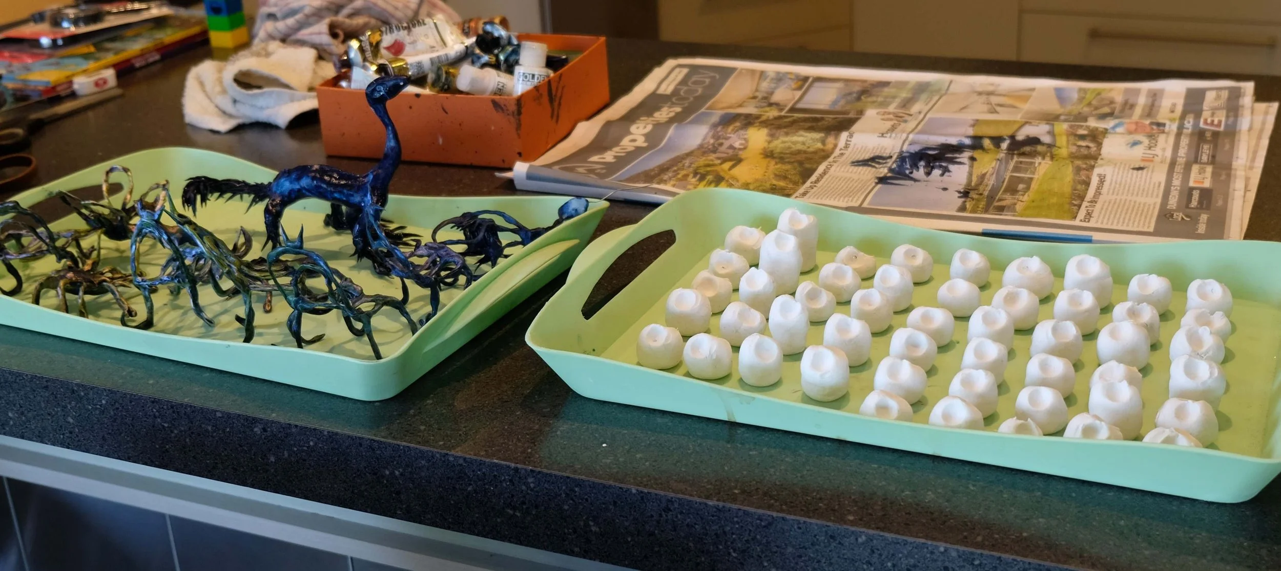 A few chairs drying on the left with a larger piece and some ‘floof’ bodies drying on the right.
