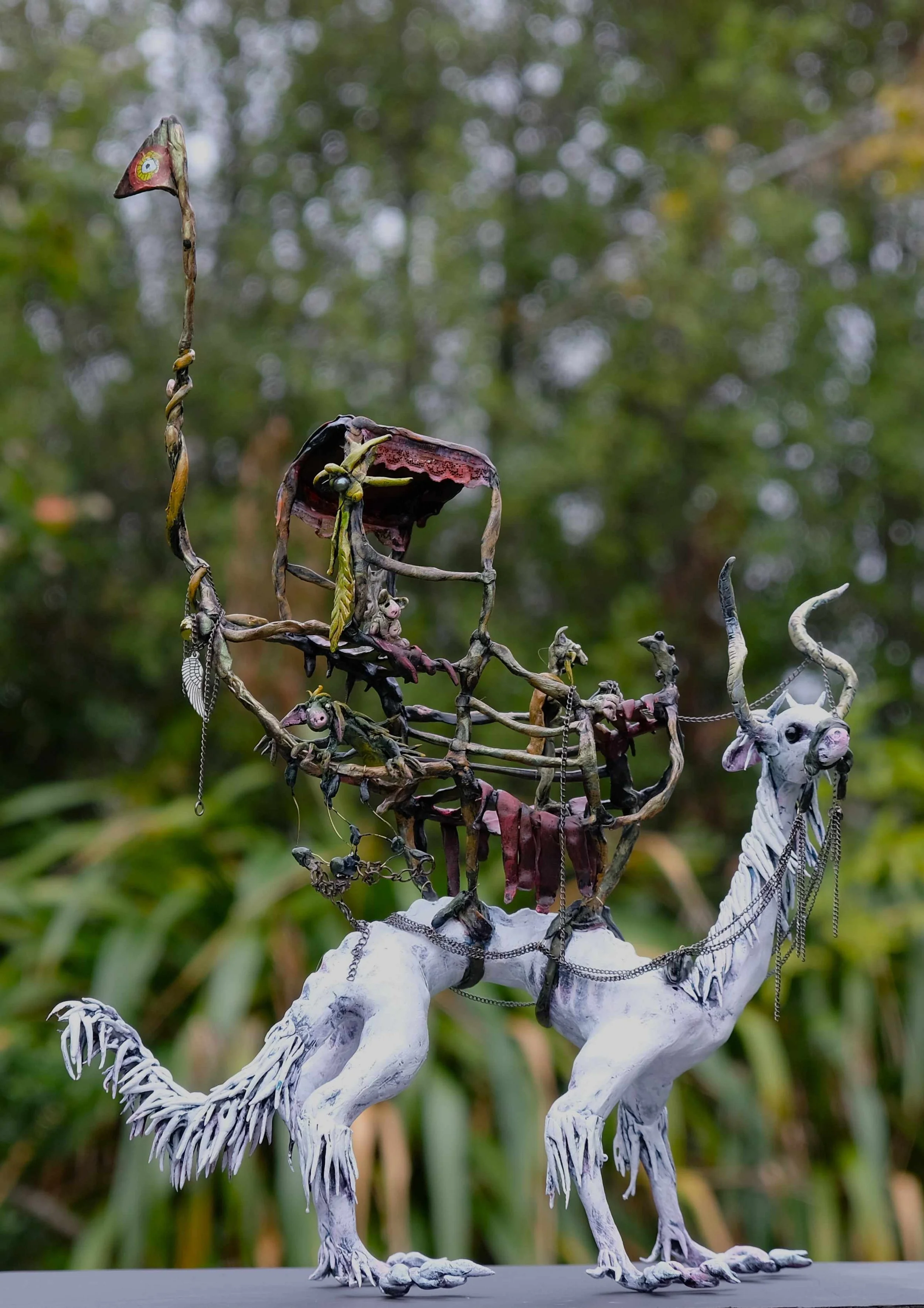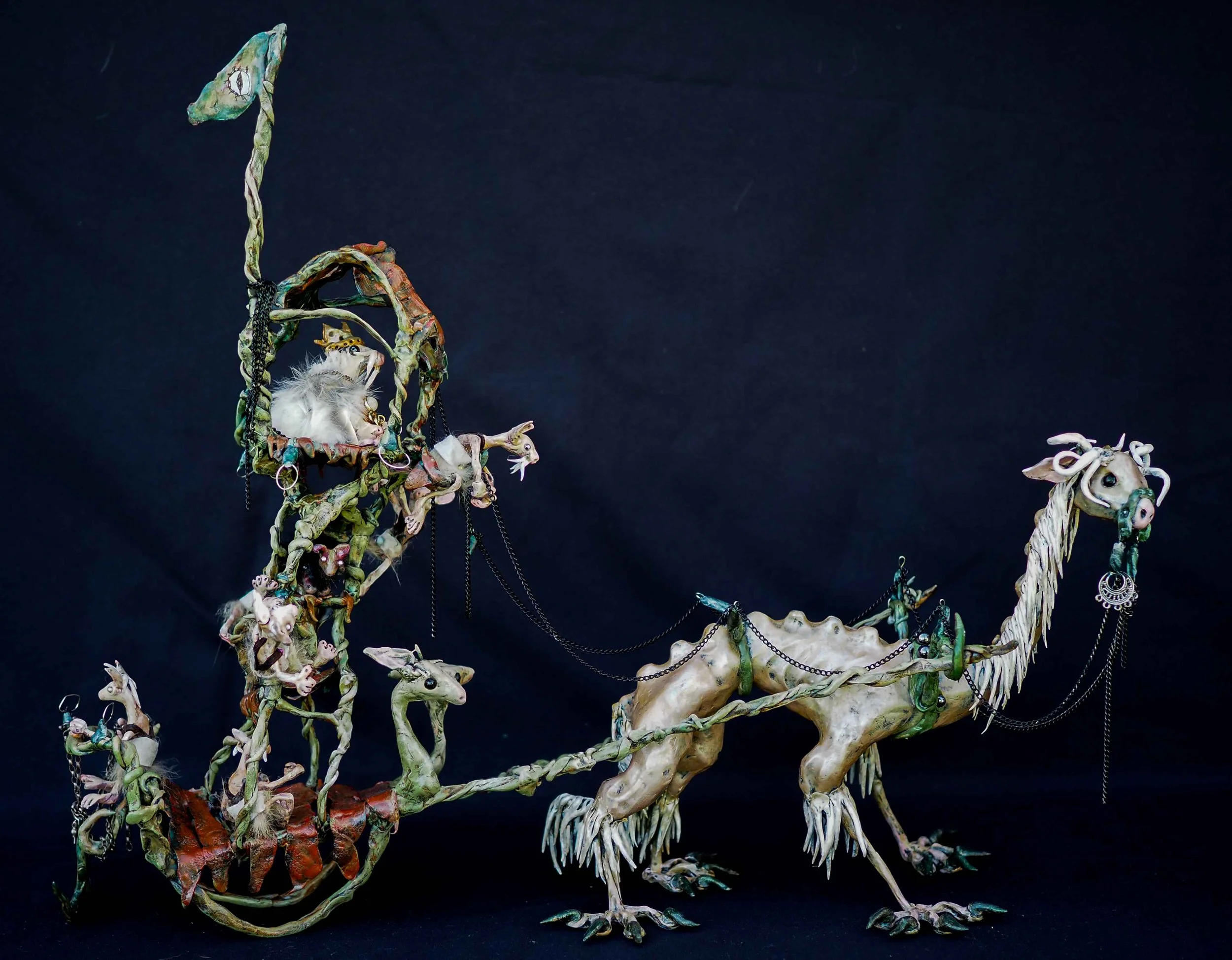 So, I wanted to make a larger work for an upcoming exhibition with the Otago Art Society so, putting away my toy cars and other distractions I thought about that necklace. When I first spied it in a secondhand shop, I already had a hazy idea about what I was going to do with it. Something elegant and graceful with an ornate carriage on its back. Maybe a rich chestnut kind of animal, maybe pearly white.