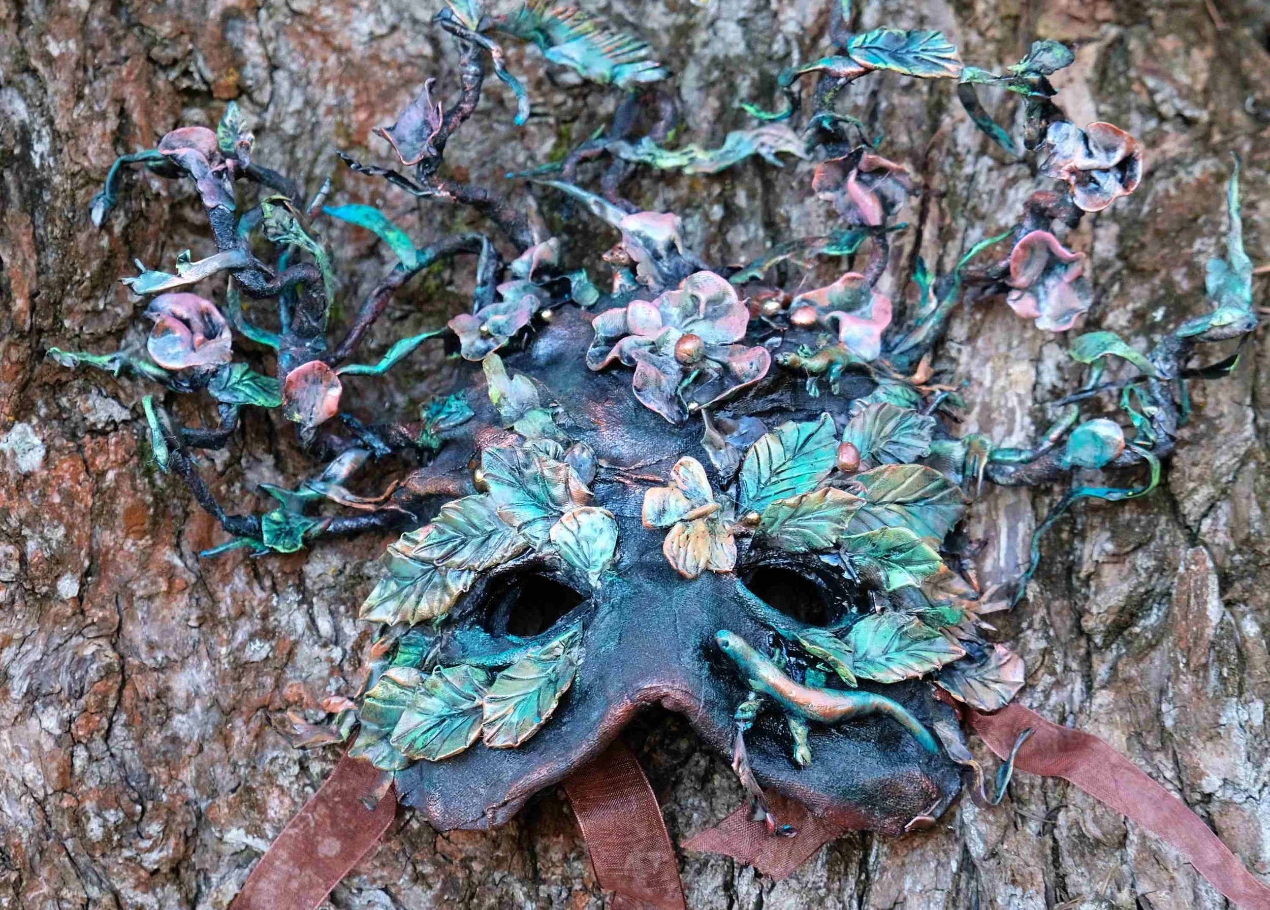 After trying the masks hanging from branches, I tried them against a tree trunk with the textured bark. Quite a different look. The more elaborate one looked almost camouflaged.
