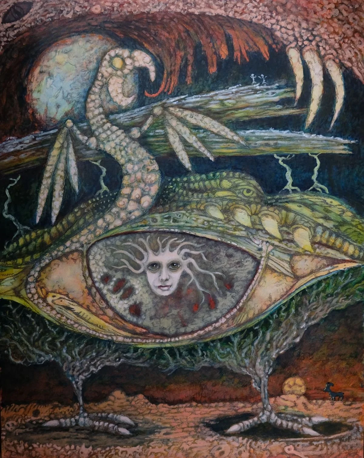 Reptile-type critters and birds can be almost any colour and pull it off, but I’ve found more natural colours work better on the horse-cat-bull creatures. I think it’s to do with my brain making sense of a piece, I can head towards reds with these, but a green would look odd. Of course there’s always exceptions, as in my circus-themed piece (a horse can be blue when it’s a circus horse). I may be making random rules but they make sense to me. Chagall had awesome green horses and blue goats so he clearly had some different rules.