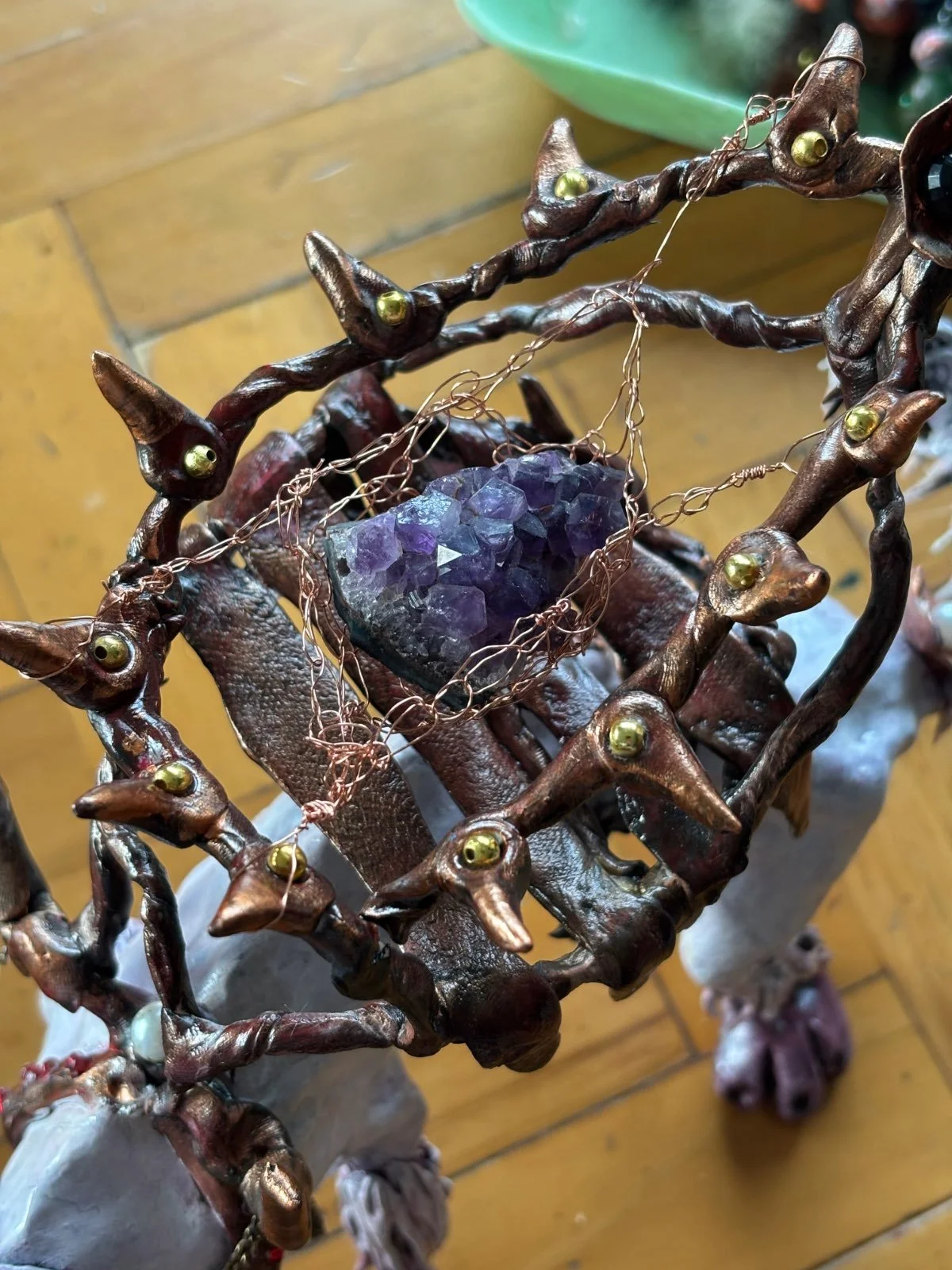 I’ve finished a work for the Otago Art Society’s Autumn exhibition due in on Sunday, this work features a small wire-crochet basket (had to re-teach myself to crochet), a bit untidy so I hope no crochet-lovers judge it too hard. I figure in whatever world these creatures come from crochet is done differently anyway.