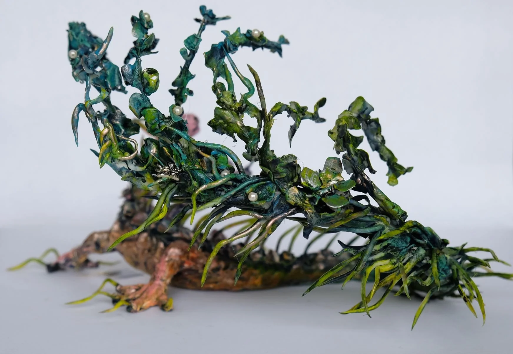 My current ‘love affair’ with flower clay came about because of my search for a material that would allow me to go finer and more delicate than paper mache. With paper mache I had created quite small and also people-sized pieces, refining techniques as I discovered more of its capeabilities and limitations.