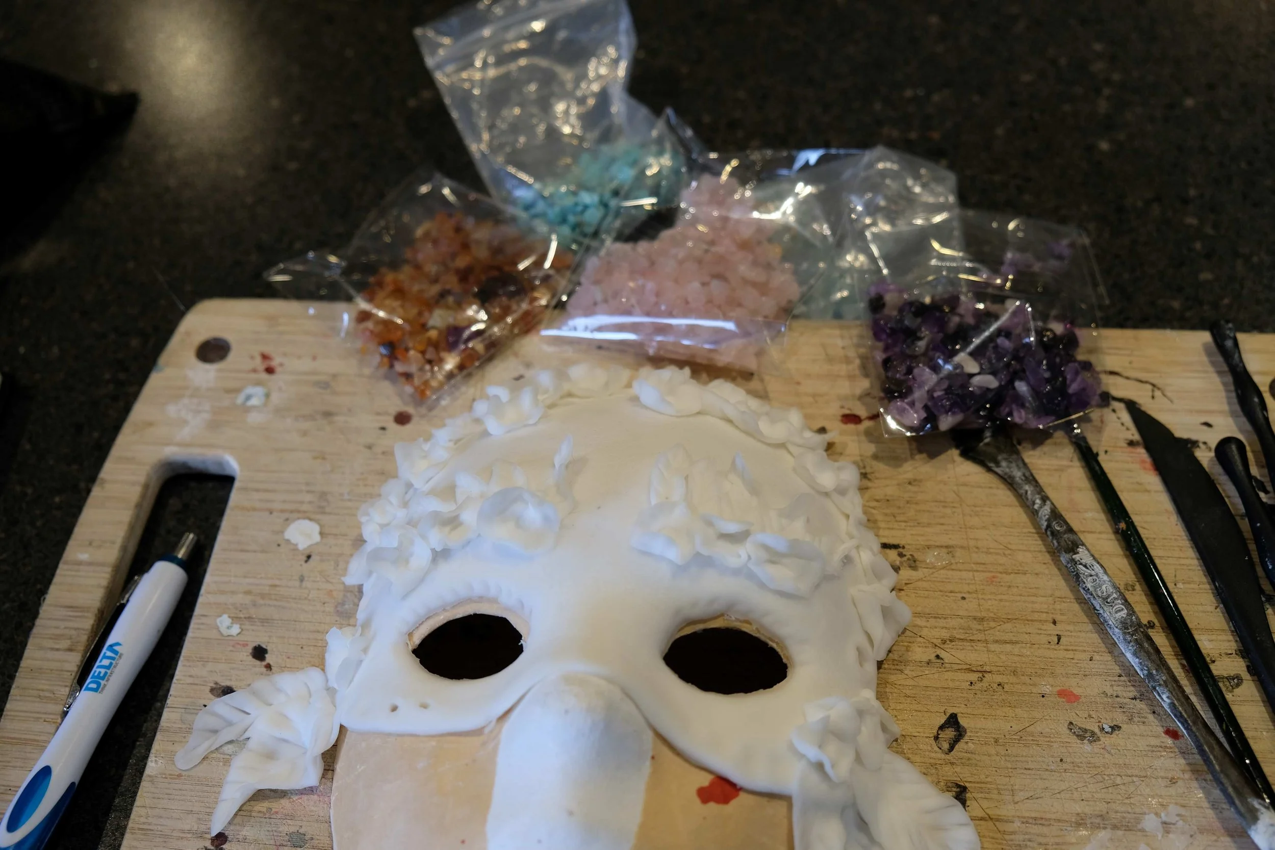 The mask base that I use to shape my masks is underneath this one in progress.
