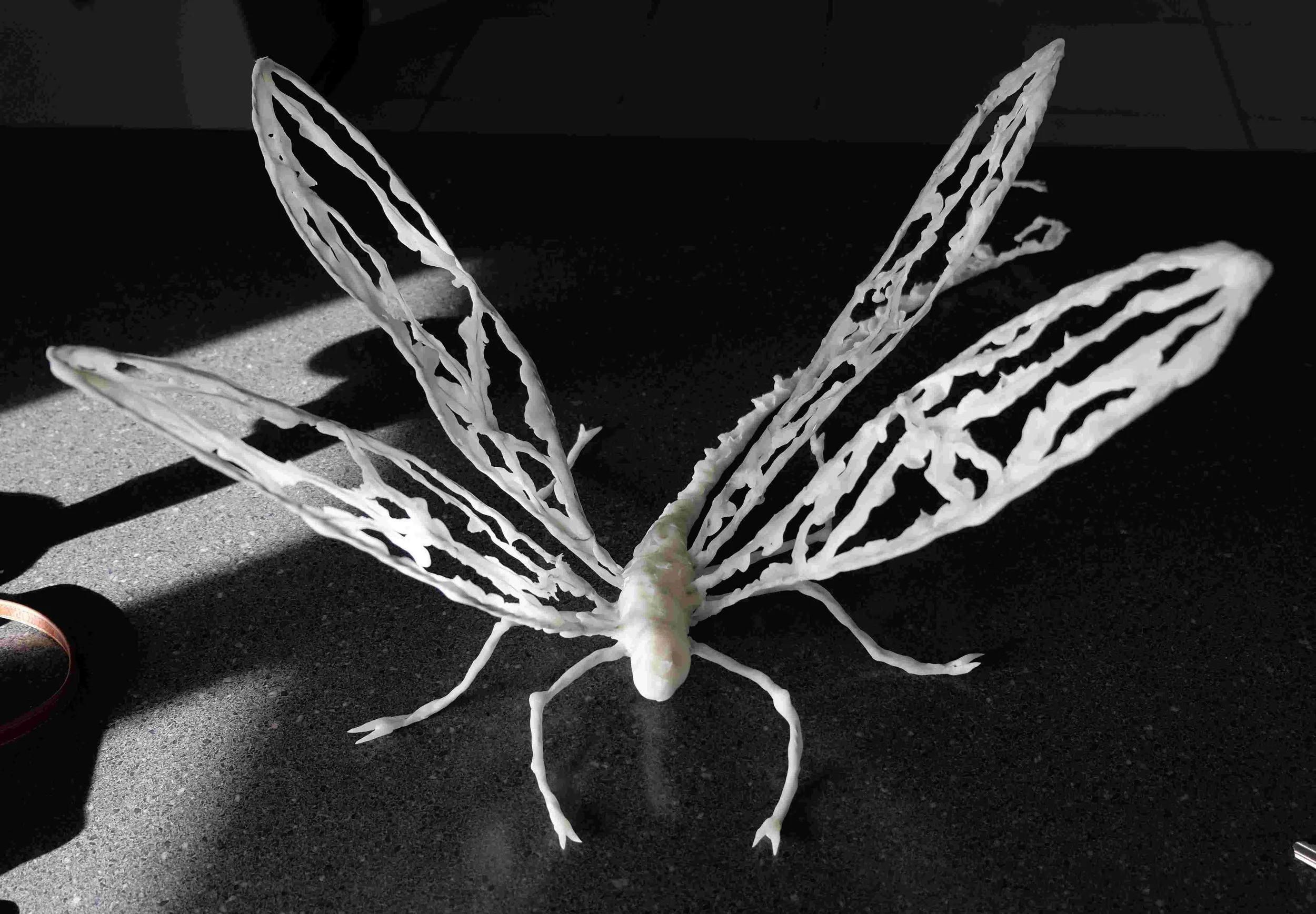 When using the clay, I flattened it out really thin over the wire in the wings so hopefully when the light catches it just right the translucency of the clay will show through. As I was making it I was also thinking about some interference paint for a bit of a shimmer.