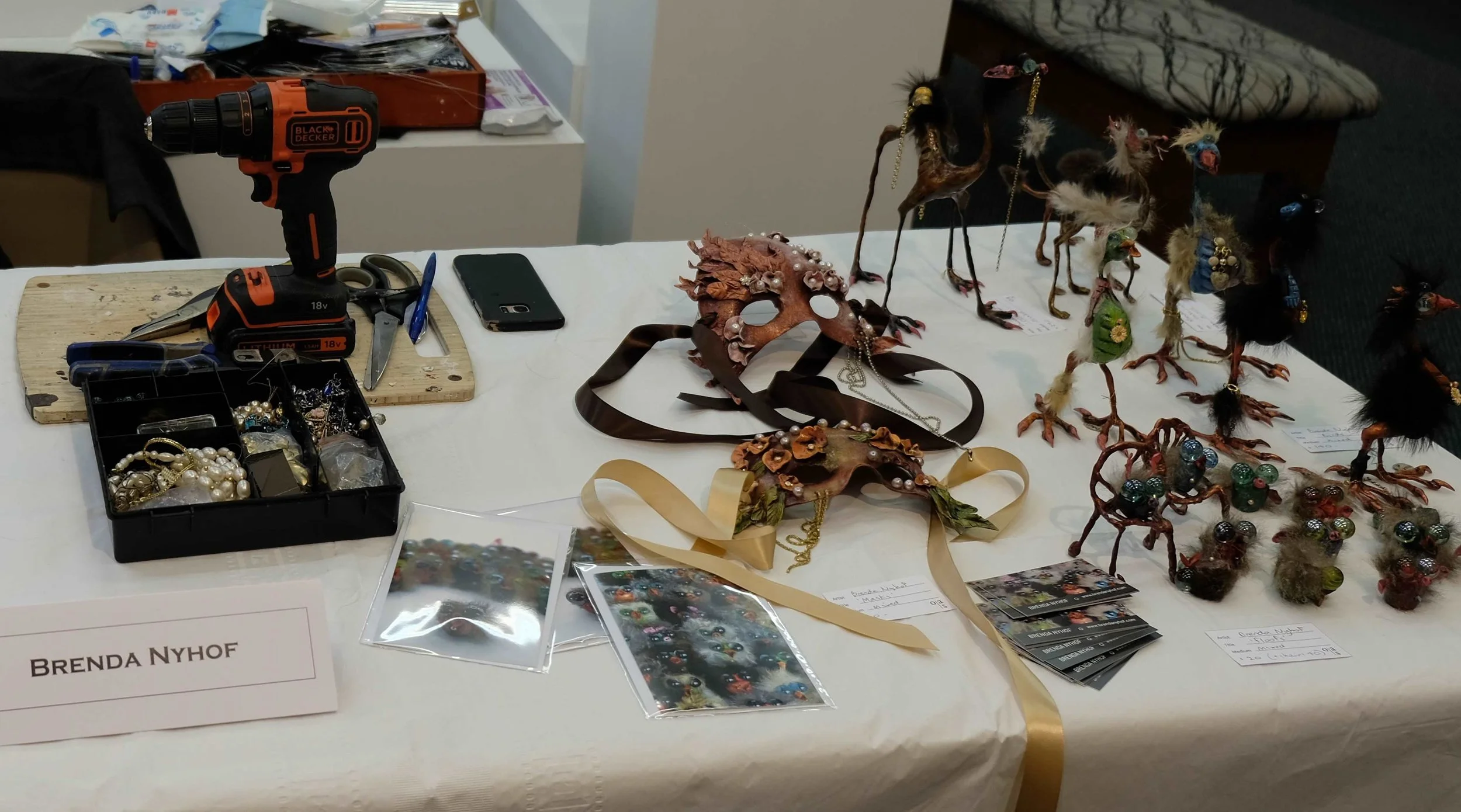It’s a great experience for visitors and artists. For a mixed media artist it means a lot of traipsing up and down stairs with armfuls of critters and materials. I never realize just how much stuff I have until I’m climbing those stairs!